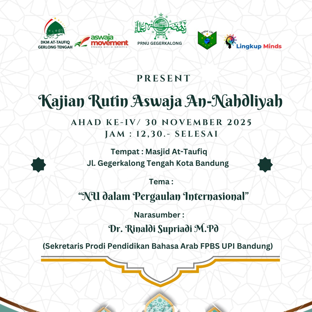 Bandung, lingkupminds.com – Pimpinan Ranting Nahdlatul Ulama (PRNU) Gegerkalong Kecamatan Sukasari Kota Bandung, KMNU UPI dan Majelis Aswaja Movement menggelar “Kajian Aswaja An-Nahdliyah” di Masjid At-Taufiq Gegerkalong Tengah, Minggu (16/11/2025) siang. Kajian pada kali ini mengambil tema “Memahami Qanun Asasi NU” dengan narasumber Wakil Rois Syuriah PCNU Kota Bandung K.H.M. Asep Usman Rosadi. Tampak hadir …